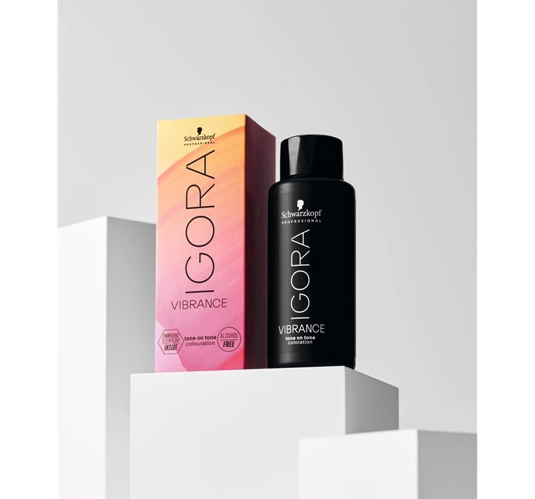 Die Ton-in-Ton-Coloration mit Igora Vibrance mit der schützenden AQUAXYL-Technologie und einem Feuchtigkeitskomplex sorgt für den richtigen Feuchtigkeitsgehalt während des Färbens, schützt so das Haar vor dem Brechen und ermöglicht ein gleichmäßiges Farbergebnis. Darüber hinaus wurde die semi-permanente Haarfarbe Schwarzkopf Professional Igora Vibrance mit pflegenden Inhaltsstoffen wie den Vitaminen B3 und B5 angereichert, die dem Haar intensiven Glanz verleihen.