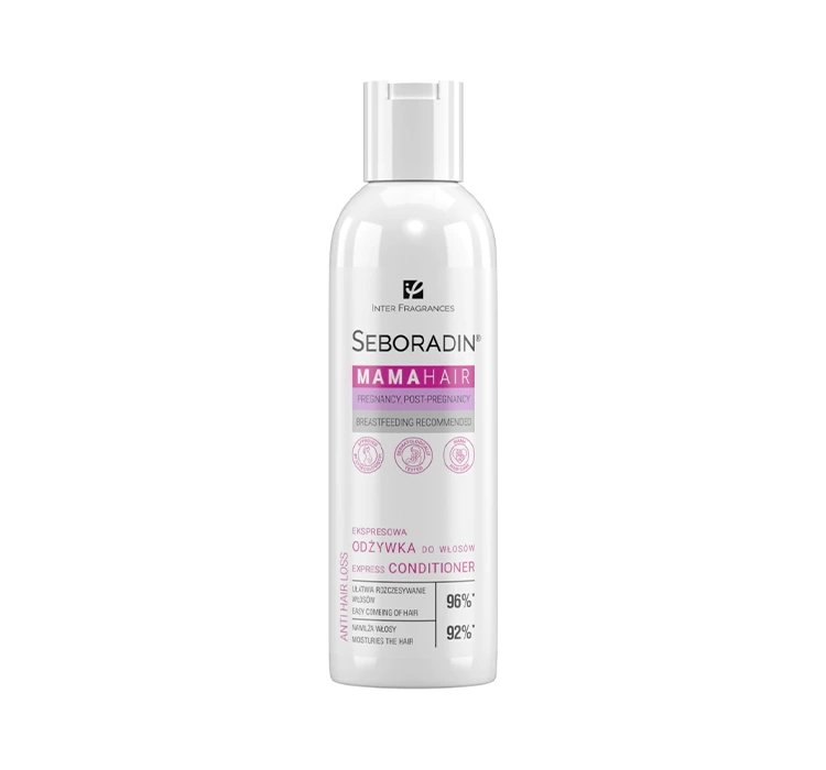 PolenIn der Serie der Kosmetika Mama Hair der Marke Seboradin finden Sie Shampoo, Standard-Haarkur sowie eine Variante ohne Ausspülen und Serum für die Kopfhaut. Die Produkte konzentrieren sich hauptsächlich auf die Verringerung von Haarausfall und die Stärkung der Haare sowie die Erleichterung des Kämmens. Die Haarkur Seboradin Mama Hair glättet, befeuchtet und nährt die Haare. Die Haarkur für ausfallendes Haar wird für Frauen ab dem zweiten Schwangerschaftsdrittel, stillende Mütter und im postpartalen Zeitraum empfohlen.