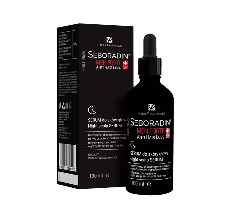 Das Serum für die Kopfhaut von Männern Seboradin Men Forte Anti-Haarausfall hat eine intensive Formel mit haarausfallhemmender Wirkung. Einwirkung über Nacht oder einige Stunden auf der Kopfhaut lässt die in den aktiven Inhaltsstoffen enthaltenen Substanzen besser absorbieren und regt die Haarfollikel an. In seiner Rezeptur finden Sie Baicapil™, Koffein und Guarana. Die entwickelte und patentierte Baicapil-Rezeptur besteht aus 3 natürlichen Inhaltsstoffen: Sojakeimen, Paradieskörnern und Baikal-Schädeldecke. Zusammen verbessern sie den Zustand der Strähnen, indem sie sie stärken, verdicken und das gesunde Wachstum fördern.