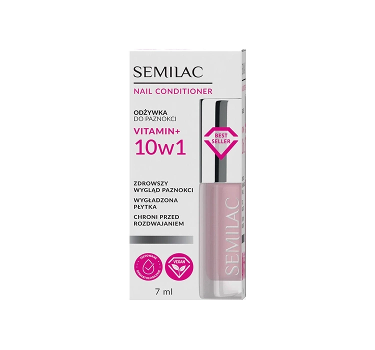 Semilac Vitamin+ 10in1 ist eine innovative Nagelpflege, die speziell für die intensive Pflege brüchiger und empfindlicher Nägel entwickelt wurde. Die Formel ist angereichert mit Vitamine E, C und F sowie Mineralien wie Silikon und Kalzium, wodurch die Nagelplatte effektiv gestärkt, Brüchigkeit reduziert und der natürliche Glanz wiederhergestellt wird. Semilac Vitamin+ 10in1 pflegt und regeneriert Nägel in kurzer Zeit, glättet die Oberfläche und erhöht die Widerstandsfähigkeit gegen mechanische Schäden, sodass sowohl Hybrid- als auch klassische Maniküre länger halten.