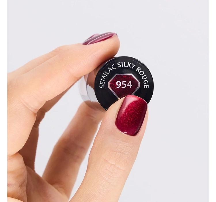 UV-Hybridlack Semilac Winter Wonderland 954 Silky Rouge ist ein dunkelroter Farbton in festlicher Ausführung, der klassisches, elegantes Rot mit subtilen, roten Glitzerpartikeln kombiniert. Diese elegante Farbe verleiht Tiefe und dezenten Glanz und eignet sich perfekt für festliche und Karnevals-Stylings.