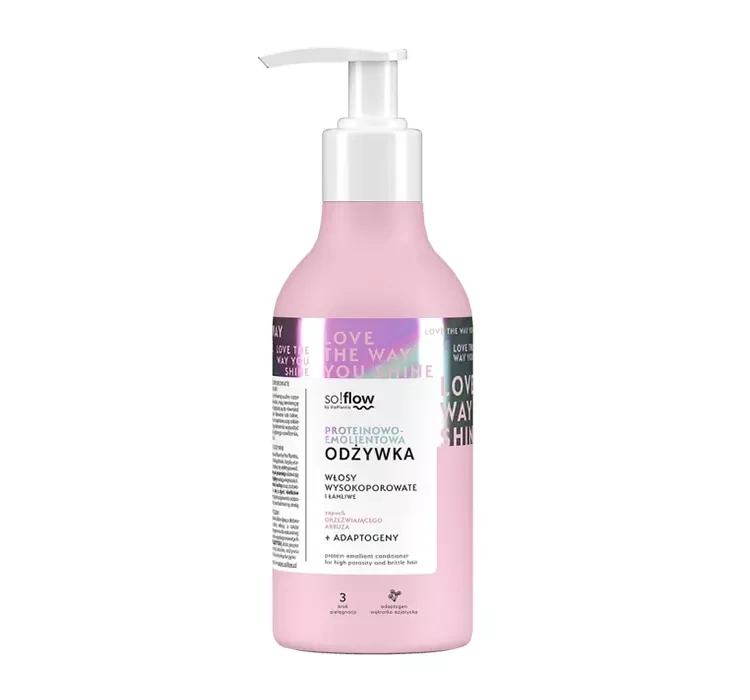 Die Rezeptur der Haarspülung für hochporöses Haar von So!flow enthält wertvolle aktive Inhaltsstoffe, die Ihre Strähnen intensiv pflegen. Die Formel enthält hydrolysierte Soja- und Weizenproteine, Jojobaester, Panthenol, Inulin, Kürbiskernöl, Weizenkeimöl und Baumwollsamenöl sowie Adaptogen in Form von Centella Asiatica, das Feuchtigkeit spendet, das Haar nährt und elastischer macht sowie antioxidativ wirkt.