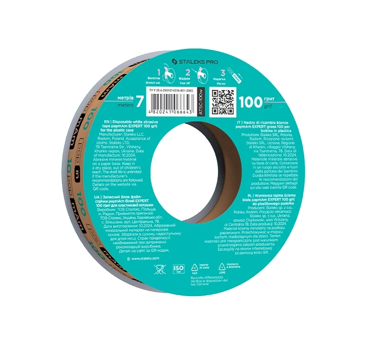 Weißes Schleifband papmAm Expert Staleks Pro ist eine innovative Lösung in Form von wechselbaren Einwegauflagen auf Rolle, entwickelt für ein sicheres und hygienisches Maniküre- und Pediküre-Erlebnis. Die papmAm-Auflagen werden wie eine Schutzhülle auf die Feilenbasis aufgesetzt, wodurch die Basis vollständig vor Kontakt mit Haut und Nägeln des Kunden geschützt ist. Das Schleifband besteht aus Kraftpapier und die Auflagen zeichnen sich durch sichere, weiche Enden aus, die ein versehentliches Schneiden des Kunden während der Arbeit verhindern. Das Band ermöglicht ein individuelles Abmessen und Zuschneiden der Auflage auf die optimal passende Länge.