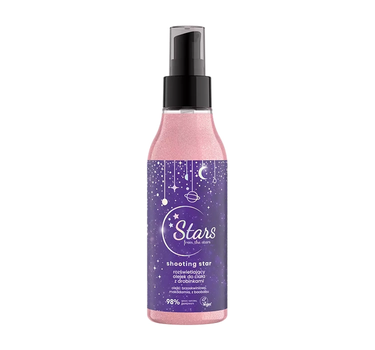 Stars from the Stars Shooting Star ist eine wunderbare Mischung aus Pfirsichkernöl, Macadamiaöl und Baobaböl. Ihre synergetische Wirkung hat einen wohltuenden Einfluss auf die Haut. Das schimmernde Körperöl mit Partikeln hat eine leichte Textur, zieht schnell ein und lässt sich mühelos verteilen.
