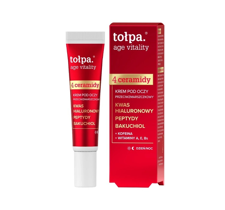• Der Anti-Falten-Augenkrem Tołpa Age Vitality mit 4 Ceramiden glättet, befeuchtet und stärkt die Haut, reduziert Anzeichen der Alterung und dunkle Ringe unter den Augen.