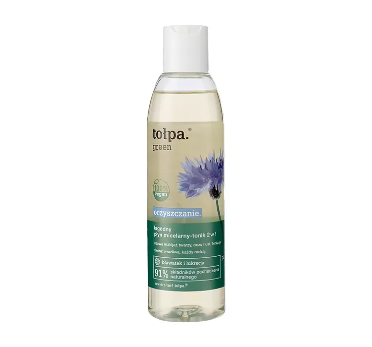 Das Tołpa green Reingiung 2in1 milde Mizellenwasser-Tonikum ist ein sanftes Reinigungsprodukt mit Kornblume und Süßholz, das der Haut ein angenehmes Gefühl zurückgibt.