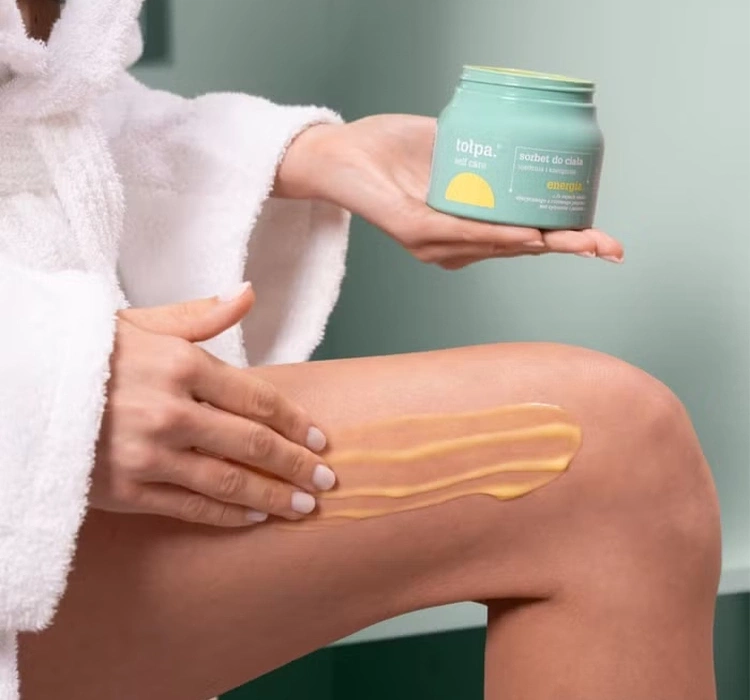 Das Tołpa Körpersorbet mit gelartiger, leichter Konsistenz verleiht der Haut Elastizität, glättet Unregelmäßigkeiten und spendet Feuchtigkeit. Der energetisierende Duft von Guarana und Orangenblüte regt an und unterstützt das Hautmikrobiom.