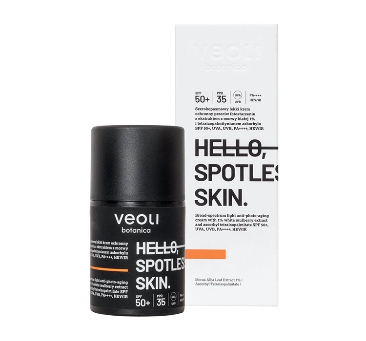 Hello, Spotless Skin Veoli Botanica ist eine innovative Sonnenschutzcreme SPF 50+, die für den täglichen Schutz der Haut vor dem gesamten Strahlungsspektrum entwickelt wurde: UVA, UVB, blauem Licht (HEV) und Infrarotstrahlung (IR). Ihre leichte Konsistenz sorgt für Tragekomfort ohne Schweregefühl, zieht schnell ein, hinterlässt keine weißen Rückstände oder fettigen Film, was sie zur idealen Wahl unter Make-up macht – selbst für Mischhaut oder fettige Haut. Das Produkt schützt nicht nur vor der Sonne, sondern auch vor oxidativem Stress in der Stadt und digitalen Bildschirmen.