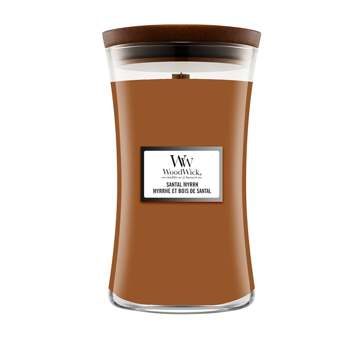 Die mittlere Duftkerze WoodWick Hourglass Jar Candle Santal Myrrh erfüllt den Raum mit einem warmen, holzigen Aroma aus Mahagoni und harziger Myrrhe, das durch goldenen Bernstein und cremiges Sandelholz eine besondere Tiefe erhält. Die sanfte Süße von Vanille und Kokos harmoniert mit dem balsamischen Elemi-Öl, während frische Zitrone und dezenter Eukalyptus eine belebende Note verleihen. Der Duft ist raffiniert, umhüllend und voller Kontraste – er verbindet warme, rauchige Akzente mit spritzigen Zitrusnoten und schafft eine Atmosphäre von Entspannung und Eleganz.