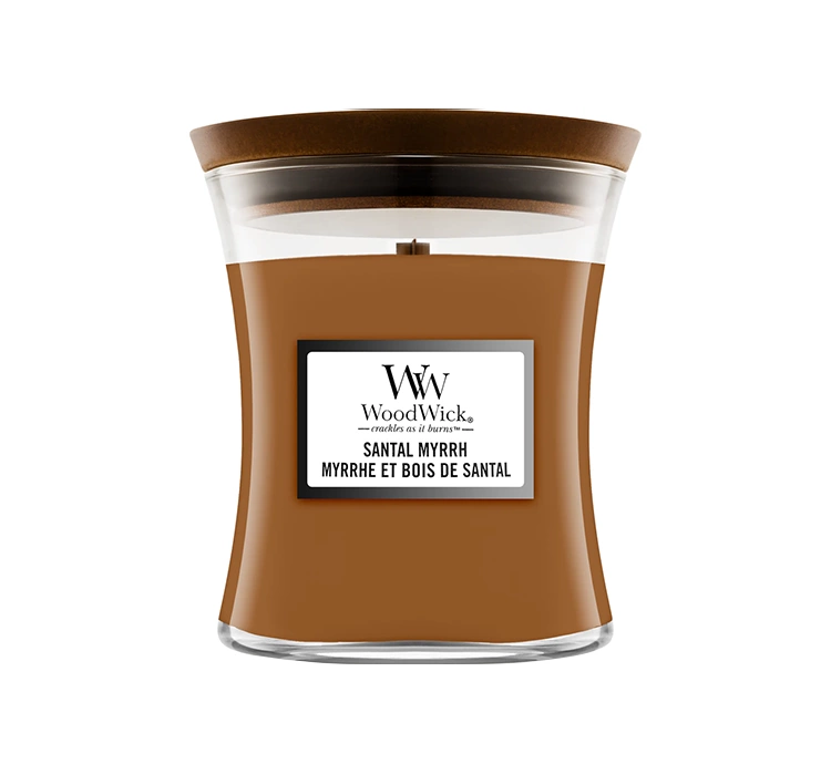 Die mittlere Duftkerze WoodWick Hourglass Jar Candle Santal Myrrh erfüllt den Raum mit einem warmen, holzigen Aroma aus Mahagoni und harziger Myrrhe, das durch goldenen Bernstein und cremiges Sandelholz eine besondere Tiefe erhält. Die sanfte Süße von Vanille und Kokos harmoniert mit dem balsamischen Elemi-Öl, während frische Zitrone und dezenter Eukalyptus eine belebende Note verleihen. Der Duft ist raffiniert, umhüllend und voller Kontraste – er verbindet warme, rauchige Akzente mit spritzigen Zitrusnoten und schafft eine Atmosphäre von Entspannung und Eleganz.