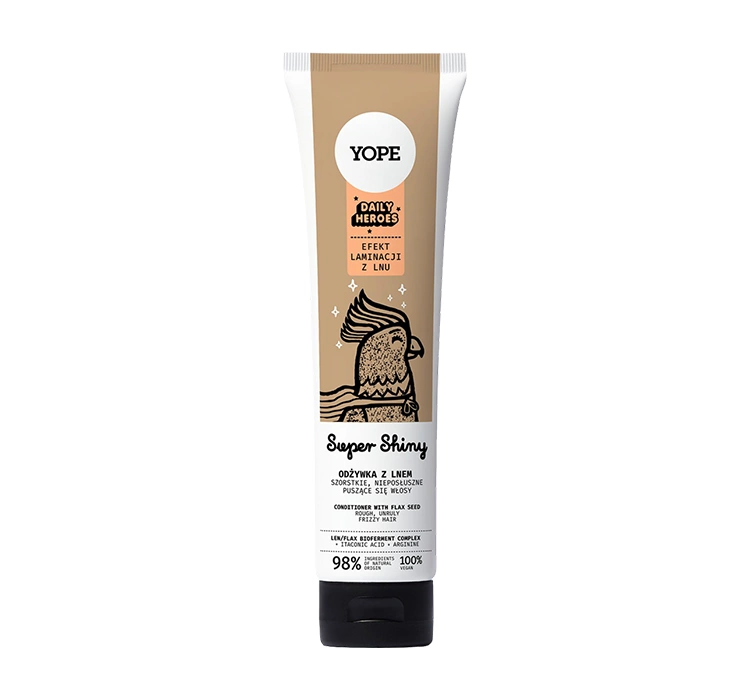 Dank einzigartiger Wirkstoffe ist die Yope Daily Heroes Super Shiny Haarspülung besonders effektiv. Biofermentierter Leinsamen regeneriert und glättet die Haarstruktur und macht sie weich und elastisch. Itaconsäure spendet intensive Feuchtigkeit und sorgt für seidigen Glanz. Arginin und Tsubaki-Öl verbessern den Zustand des Haares, schützen vor Schäden und bewahren die Feuchtigkeit.